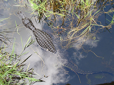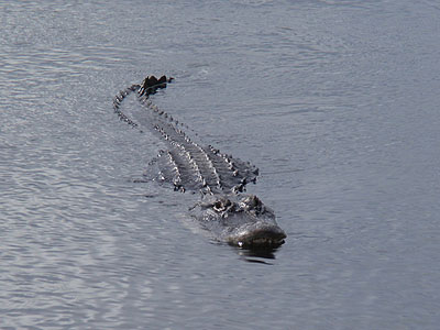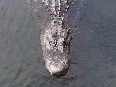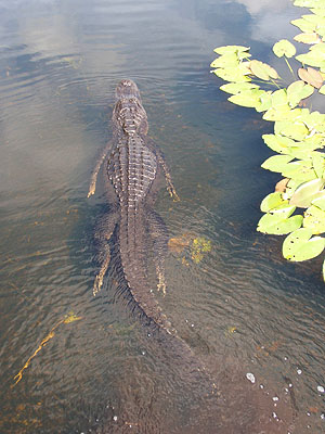 ...za chvíli se zavlnila vodní hladina a před námi se objevil první vzrostlý aligátor americký (Alligator mississippiensis)   Abychom si ho mohli pořádně prohlédnout, připlaval aligátor vzroně až pod dřevěný chodník, na kterém jsme stáli. Chvíli se schoval v jeho stínu a potom pokračoval v plavbě dál mezi lekníny.