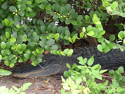 Na chvíli jsme se zastavili na další slepé odbočce, která nás zavedla k nevelkému mokřadu. Jak se tak rozhlížíme, tak najednou zjišťujeme, že ve křoví hned vedle chodníku leží další aligátor. Naštěstí spal...   Cestou zpátky k autu jsme v tůňce vedle chodníku objevili dalšího aligátora, dnes již čtvrtého. Ze začátku to vypadlao, že toho na Aningha Trail moc neuvidíme, ale nakonec jsme na další stanoviště odjížděli nadšení!